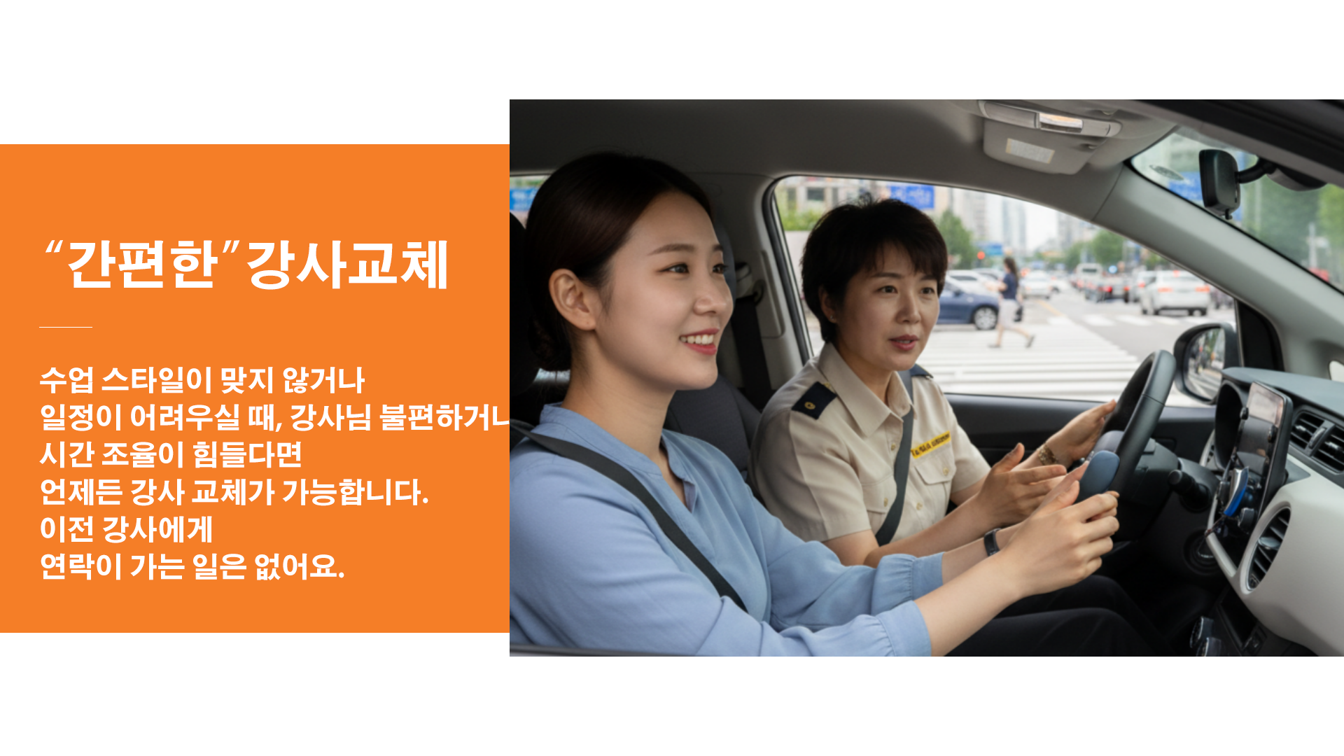 가능합니다! 첫날은 관양·호계 주택가 같은 한적한 이면도로에서 핸들 감각·브레이크 압 조절부터 시작하고 이후 범계역 사거리, 평촌대로, 인덕원역 주변 등 실제 교통량이 많은 도심으로 단계적으로 확장합니다.