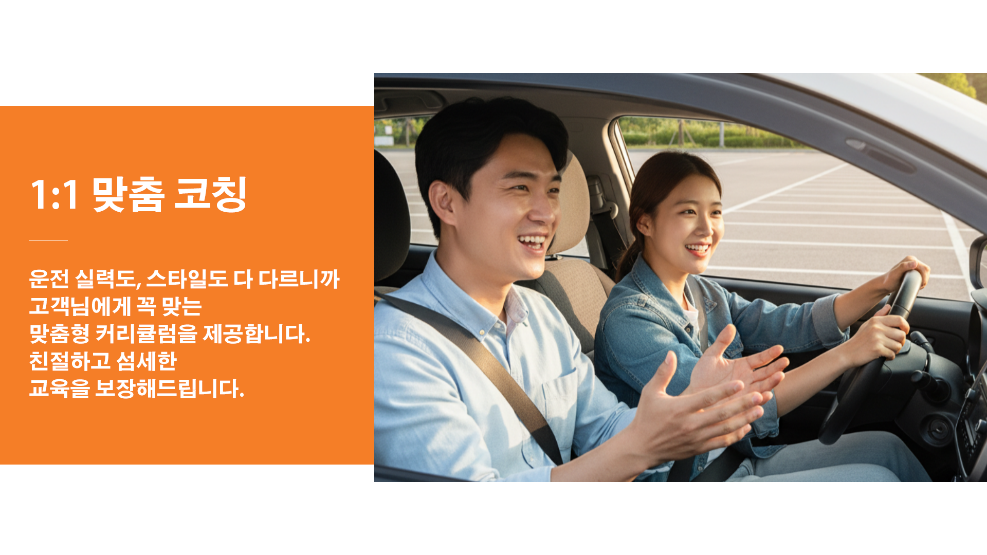 연수차(보조브레이크 장착)로 진행하는 것이 기본이며 자차 연수도 가능합니다. 자차 이용 시에는 안전장치와 보험 조건을 확인해야 해요.